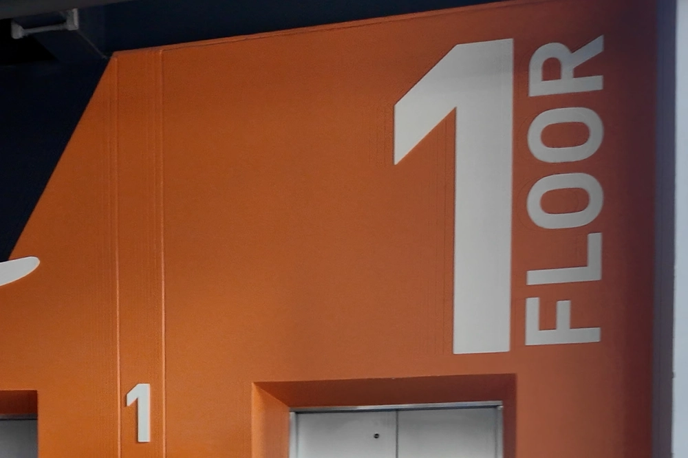 - Look for the Stadium One logo. Walk along the building for ~100 meters, then turn right.